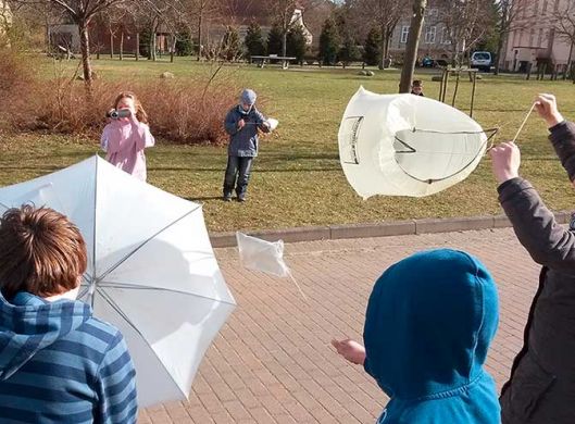 Von Anfang März bis in den August 2014 trafen sich Schülerrinnen und Schüler der Lilienthal-Grundschule Rhinow an jedem Samstag in einem Projektraum des Lilienthal Centrum Stölln um in gemeinsamer Arbeit zwei großformatige Flugobjekte zu schaffen und deren flugtechnische Eigenschaften zu erforschen.
