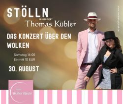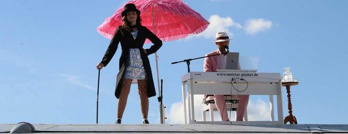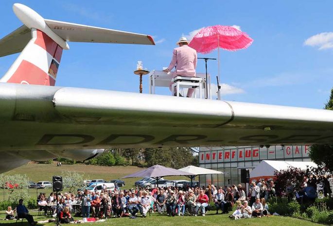 Salonmusiker Thomas Kübler, bekannt für seine stilvolle Mischung aus Chanson, Schlager und frühem Pop, entführt sein Publikum in eine andere Zeit – irgendwo zwischen Berliner Wintergarten, französischem Salon und Freiluft-Varieté. Auf dem Rumpf der ehemaligen DDR-Regierungsmaschine bringt er Klavier und seine unverwechselbare Stimme zum Klingen.