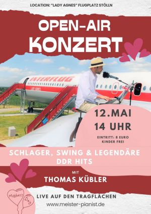 In einer Wow!-Kulisse in luftiger Höhe wird Thomas Kübler auf den Tragflächen des Passagierflugzeugs am Piano Platz nehmen und Schlager, Swing-Titel und, ganz neu im Konzertprogramm, legendäre Hits aus der DDR präsentieren. Dieses Konzert verführt Besucher nicht nur mit einer atemberaubenden Kulisse, sondern entführt auch noch in die faszinierende Welt der DDR-Schlagermusik, die eine ganze Generation geprägt hat. Künstler wie Bärbel Wachholz, Ruth Brandin, Holger Biege, Günter Hapke und ihre Lieder prägten die Musiklandschaft der DDR und bleiben bis heute unvergessen.