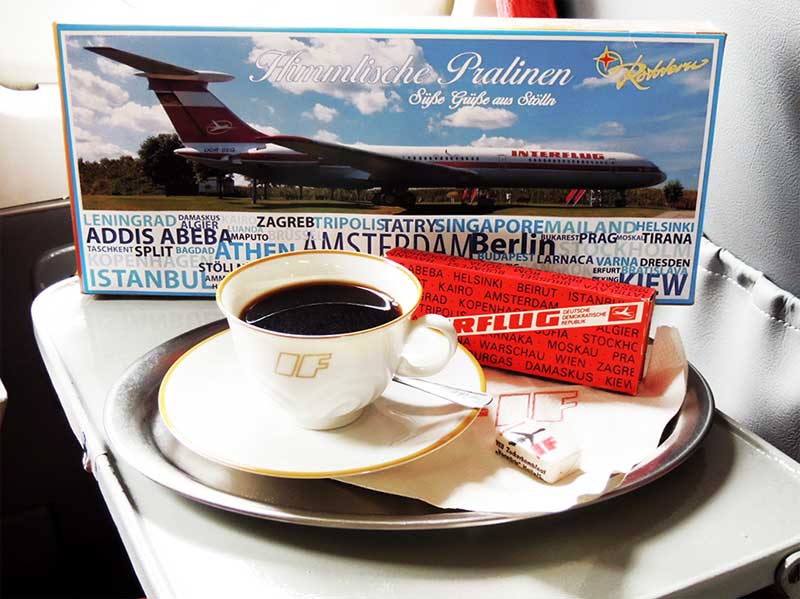 In 12.000m Höhe überfliegt die IL-62 der Interflug auf dem Weg von Berlin-Schönefeld nach Havanna den Atlantik. Das Wetter ist ideal, die Maschine liegt ruhig in der Luft. Viele Passagiere lesen, einige schlafen andere unterhalten sich angeregt miteinander. Ein Passagier hat Lust auf einen Kaffee und bestellt diesen bei der charmanten Stewardess. In der Bordküche richtet sie ein kleines Silbertablett, während ihre Kolleginnen schon die Mahlzeiten für das anstehende Abendessen vorbereiten. Auf dem Tablett das Kaffeegedeck mit Milch und Zucker, oder wie es damals so schön hieß: komplett. Da zu einer Tasse Kaffee immer etwas Süßes passt, holt sie aus einem Container der Bordverpflegung eine kleine Schachtel Pralinen und serviert diese zum Kaffee. Mit einem Lächeln bedankt er sich für diese kleine süsse Aufmerksamkeit bei der Stewardess. Nicht nur bei Passagieren standen diese kleinen Pralinenschachteln mit dem Interflug-Schriftzug hoch im Kurs, auch auf den Zielflughäfen waren diese kleinen süßen Aufmerksamkeiten sehr begehrt und manchmal öffneten diese nicht nur die Herzen der dortigen Bodenmitarbeiter, sondern beschleunigten manche Vorgänge der Abfertigung wenn z.B. auf Grund einer Verspätung der Flieger in kürzerer Zeit für den Rückflug nach Berlin-Schönefeld vorbereitet werden musste. Die kleinen handlichen Pralinenschachteln mit 5 verschiedenen Pralinen wurden damals von ROTSTERN im VEB Thüringer Schokoladenwerke Saalfeld/Saale gefertigt. ROTSTERN als Marke und bekannt für ihre Süss- und Schokoladenwaren existiert noch heute und was lag näher, als die Kooperation mit Interflug von damals neu zu beleben. So gibt es jetzt in Anlehnung an damals einen Pralinenkasten "Feinste Pralinenauswahl" mit 200g Inhalt verschiedenster Pralinenspezialitäten, wie z.B. den beliebten Nougattütchen. Ein großes Bild der IL-62 "Lady Agnes", eingefasst von den Zielorten die von Interflug angeflogen worden sind, zieren die Verpackung. Wer auf die schlanke Linie achtet und nur eine Kleinigkeit naschen möchte, der findet sicherlich auch mit einer kleinen 4er- oder 8er-Kollektion an handgefertigten Pralinen die richtige Auswahl für den süßen Moment. Auch als Mitbringsel eignet sich dieser süße Gruß aus Stölln bestens. Erhältlich sind die schokoladigen Souvenirs im Lilienthal Centrum Stölln und wir freuen uns auf Ihren Besuch bei uns, einem der fünf Standorte zur BUGA 2015.
